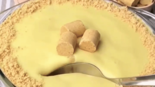 Repita a operação por mais 4 vezes. Na última vez coloque o chocolate Bis inteiro para que fique incrustado no chocolate.